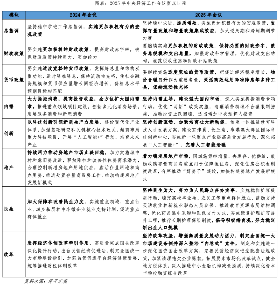 第一大信号,总基调强调积极有为、加大力度、提质增效,表述积极。2026年是“十五五”的开局之年,要想达成2035年经济总量翻番、人均 GDP 也翻番的目标,仍需保持5%左右经济增速。因此会议定调2026年宏观政策“更加积极有为”,政策基调延续宽松,重点领域政策力度有望加码。