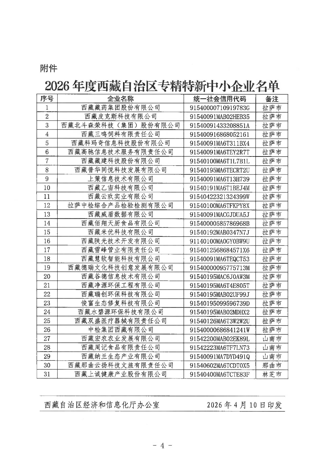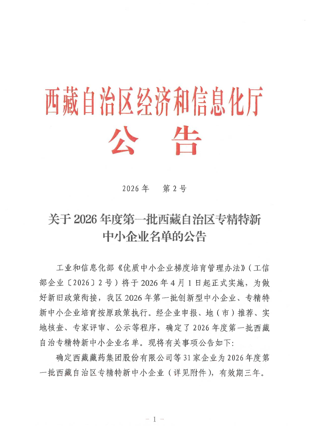关于2026年度第一批西藏自治区专精特新中小企业名单的公告